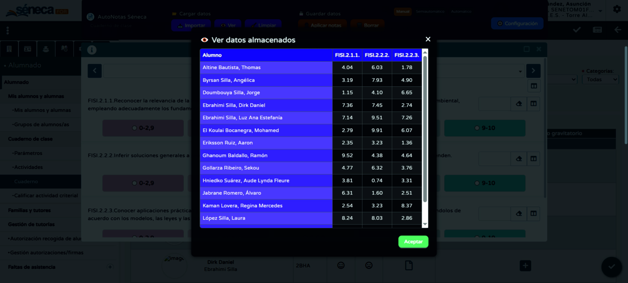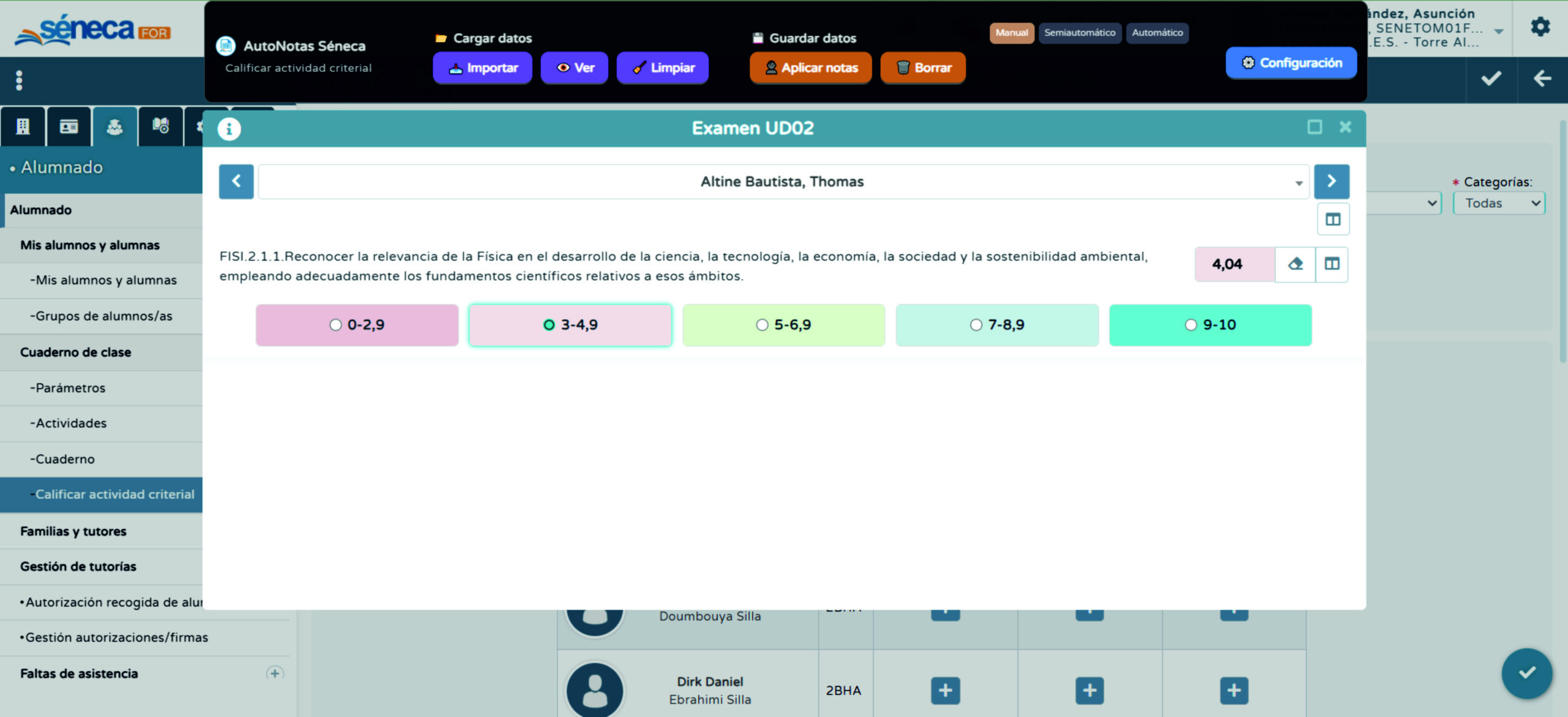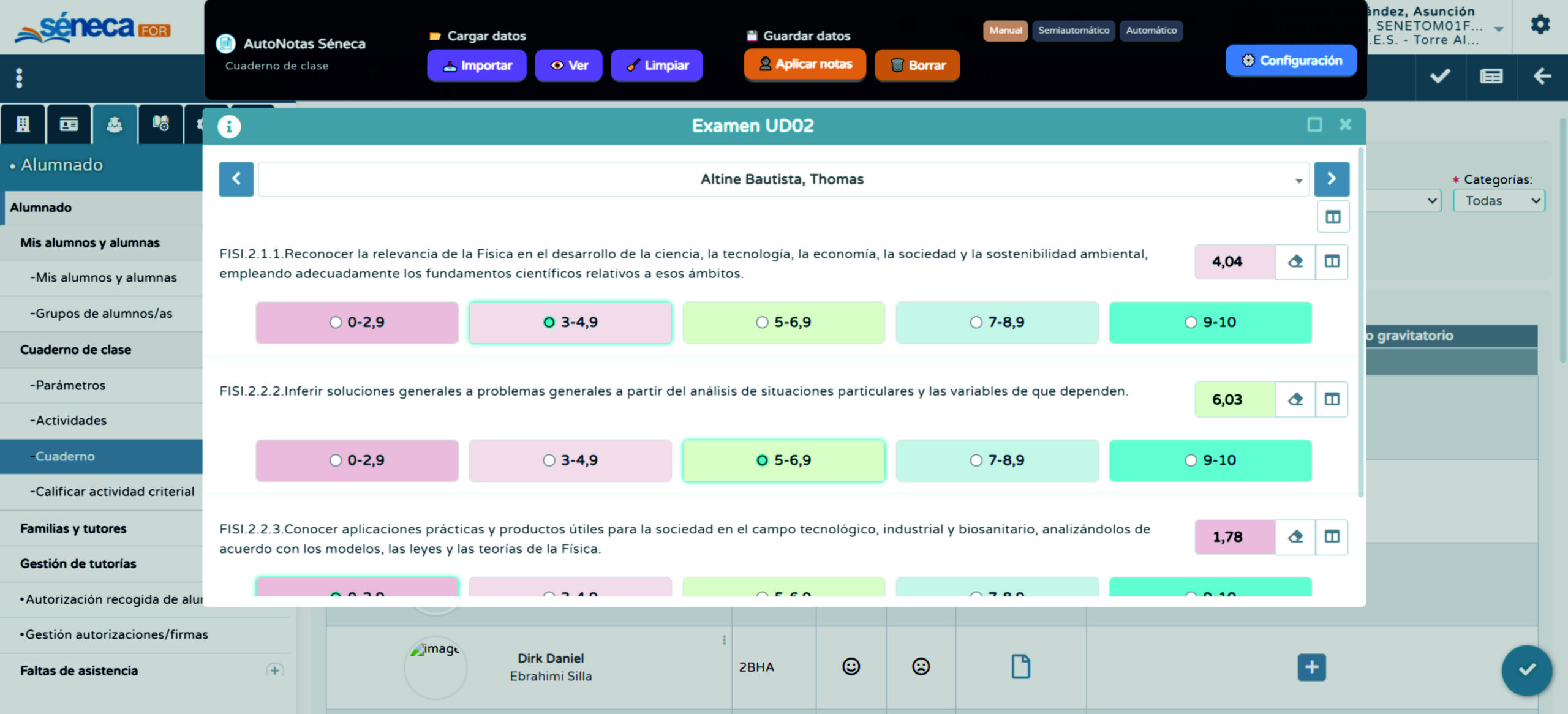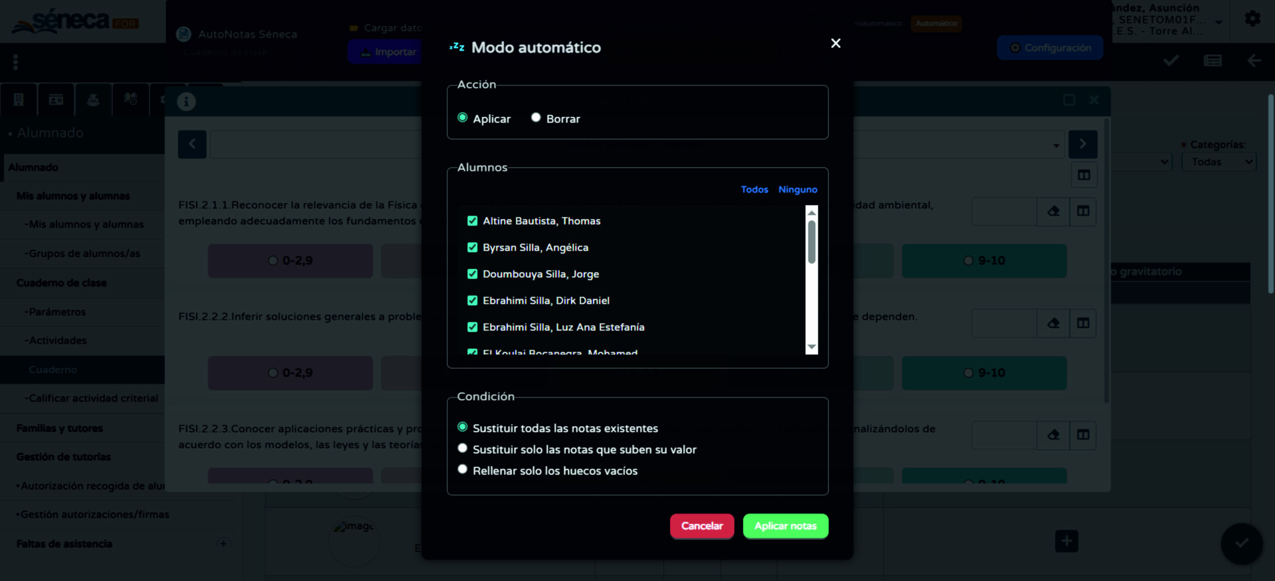 - Aplicar automáticamente las notas al alumno actual dentro del Cuaderno de Séneca.