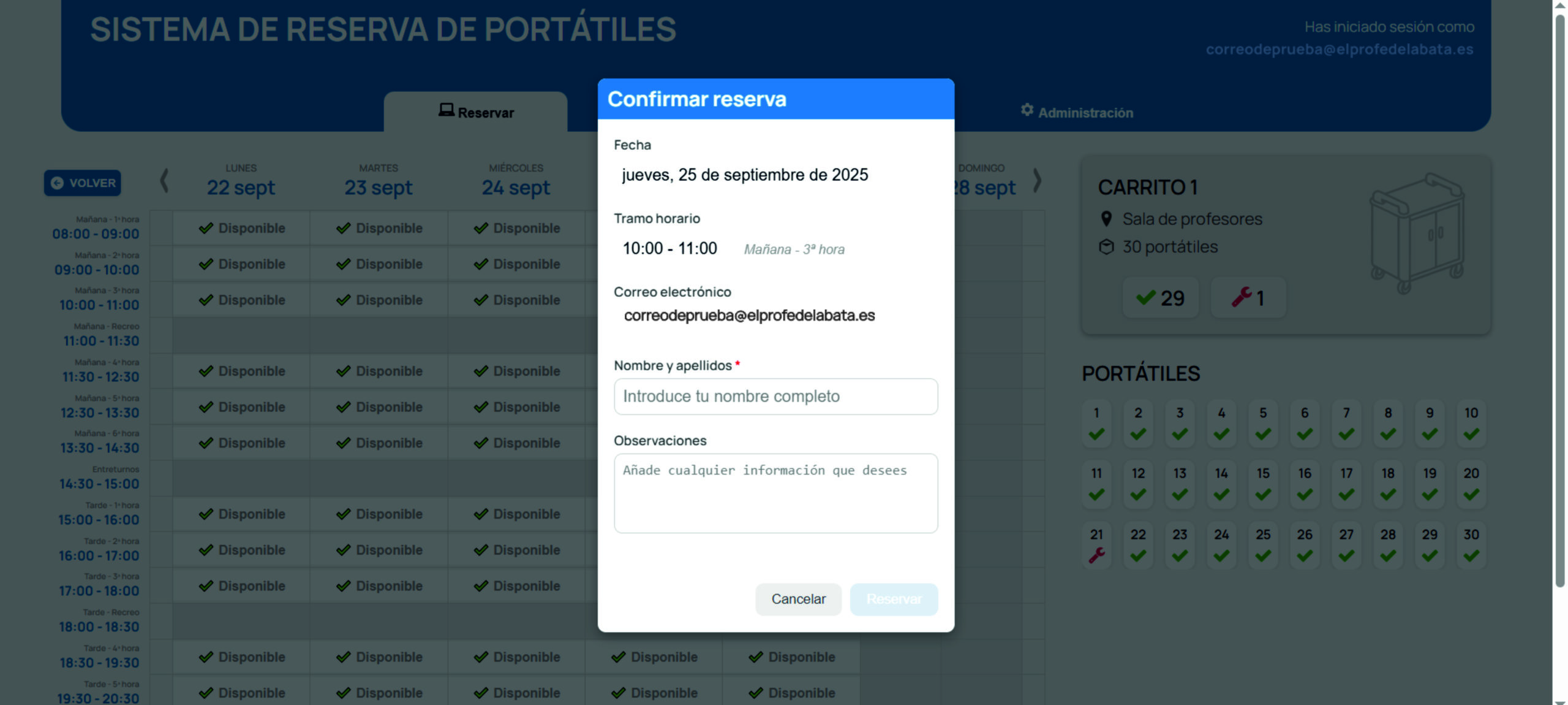 CResPo es una aplicación web diseñada para facilitar el día a día del profesorado. Gracias a esta herramienta, cada docente podrá consultar la disponibilidad de los carritos de portátiles de su centro en tiempo real y realizar reservas de forma rápida, segura y desde cualquier dispositivo.