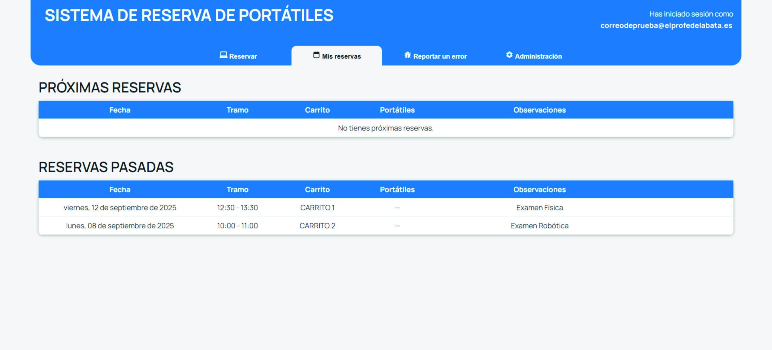 - Gestión de reservas: consultar próximas y pasadas, y cancelarlas con un clic.